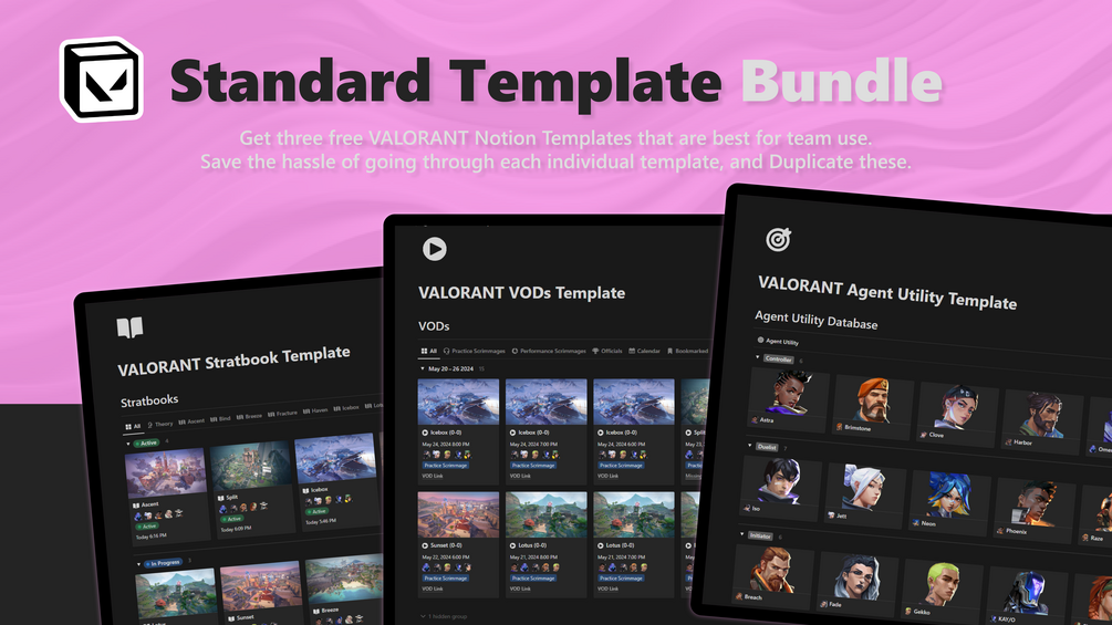 This bundle includes 3 of my free VALORANT Notion Templates best for personal or team use. These are the best VALORANT Free Notion templates to start with that cover the fundamental areas of a team.