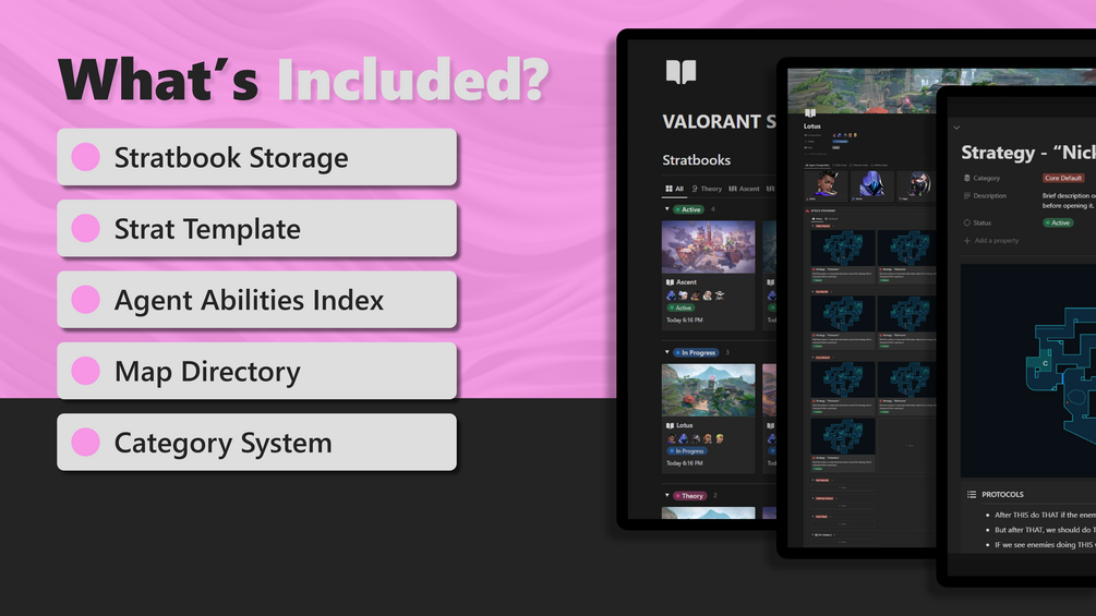 This Notion template is crafted to streamline the organization of your VALORANT Stratbooks into a readily accessible database. Create Stratbooks with detailed agent insights and utilize neatly organized templates for individual strategies. Easily categorize each Stratbook as Active, In Progress, Theory, or Archived for effortless management.
